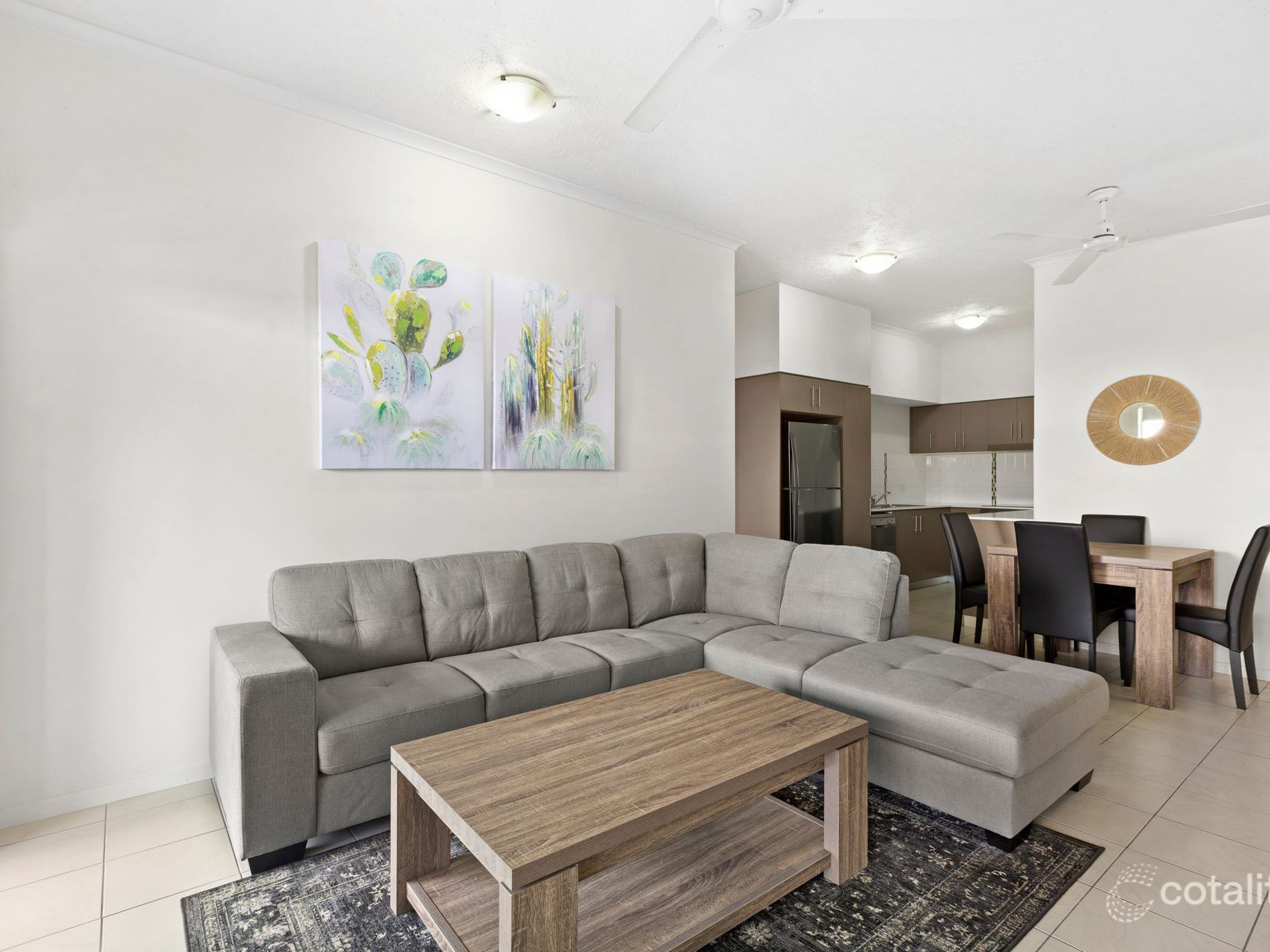 - Open-plan tiled living and dining areas